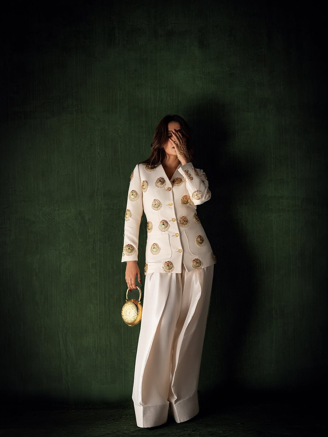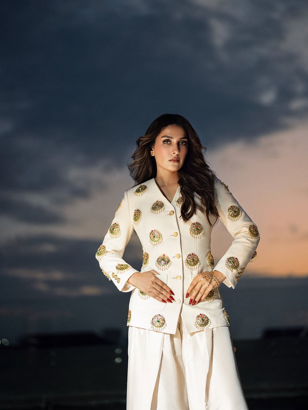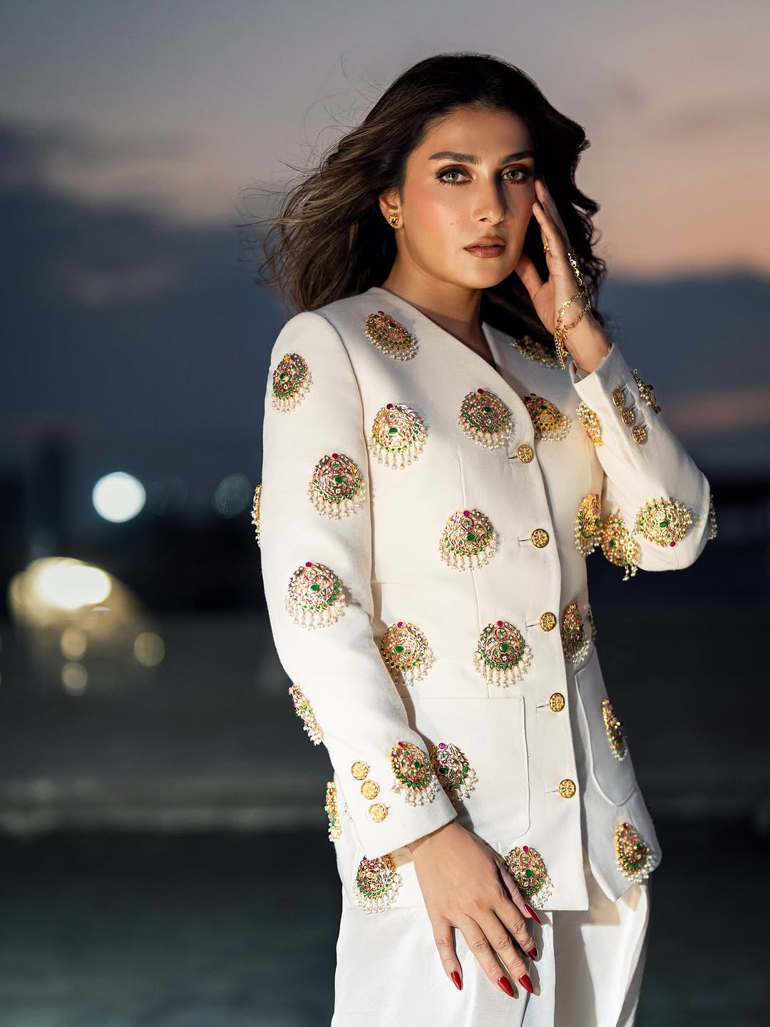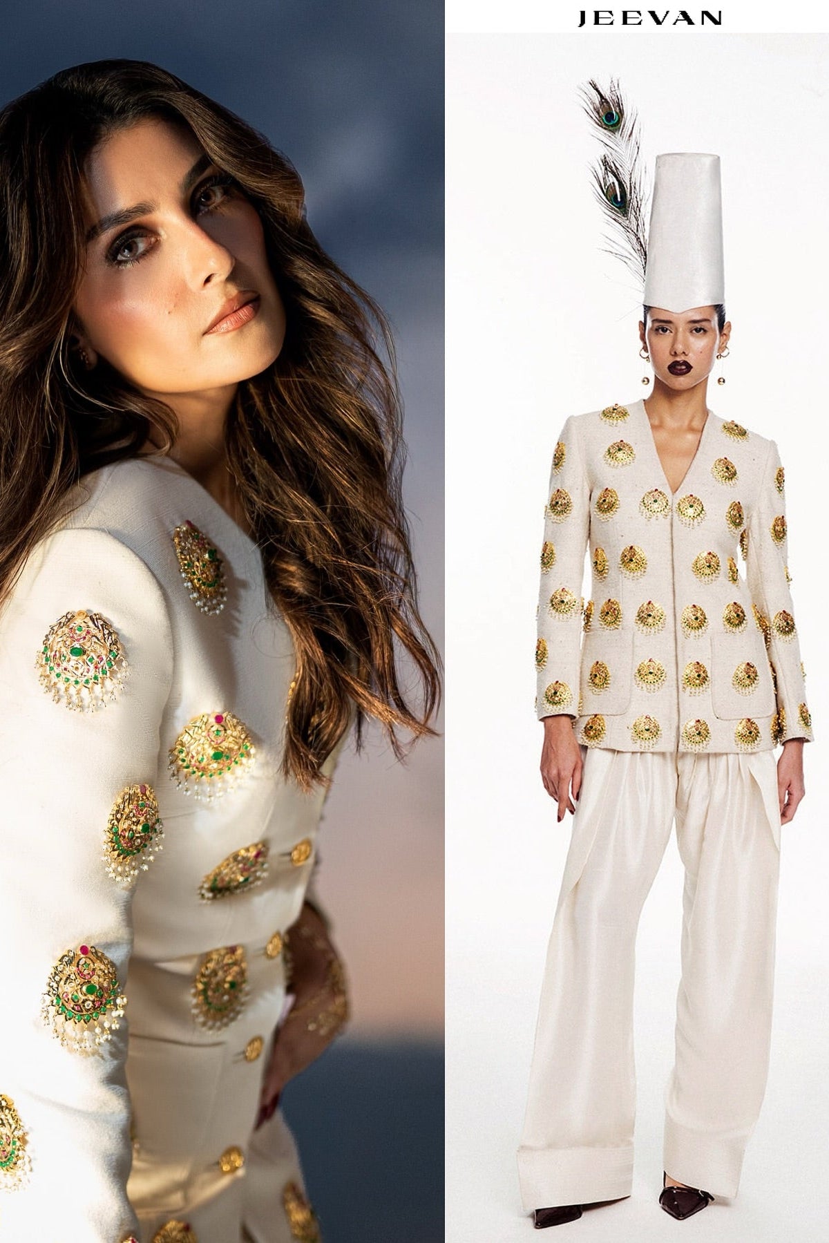 This sophisticated ensemble features a tailored jacket crafted from exquisite Russian Raw Silk fabric, showcasing impeccable craftsmanship and attention to detail. The jacket is elevated with a custom-made hand jewel, thoughtfully placed on the base to add a touch of refined elegance. Paired with a raw silk shalwar, known for its luxurious texture and timeless appeal, this outfit effortlessly combines modern tailoring with traditional charm, making it an exceptional choice for distinguished occasions.