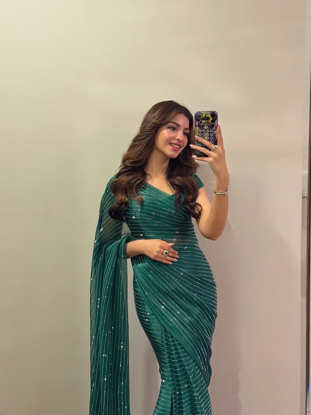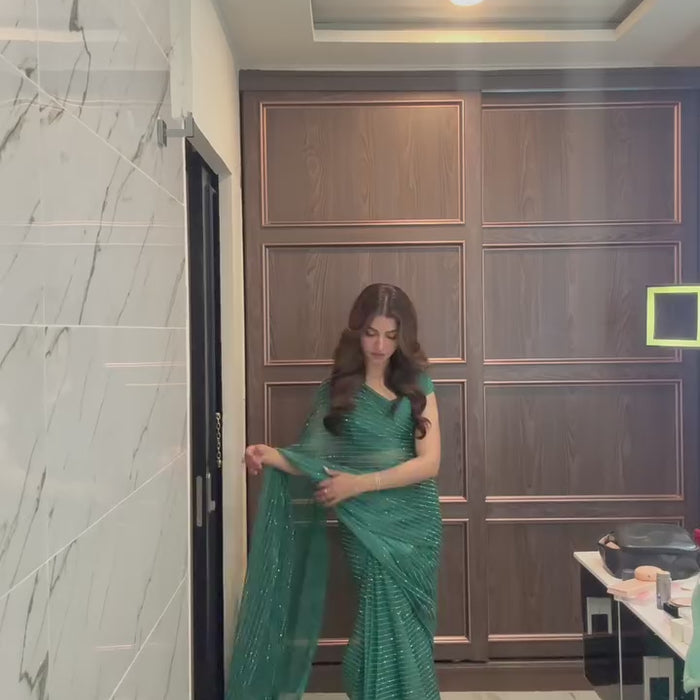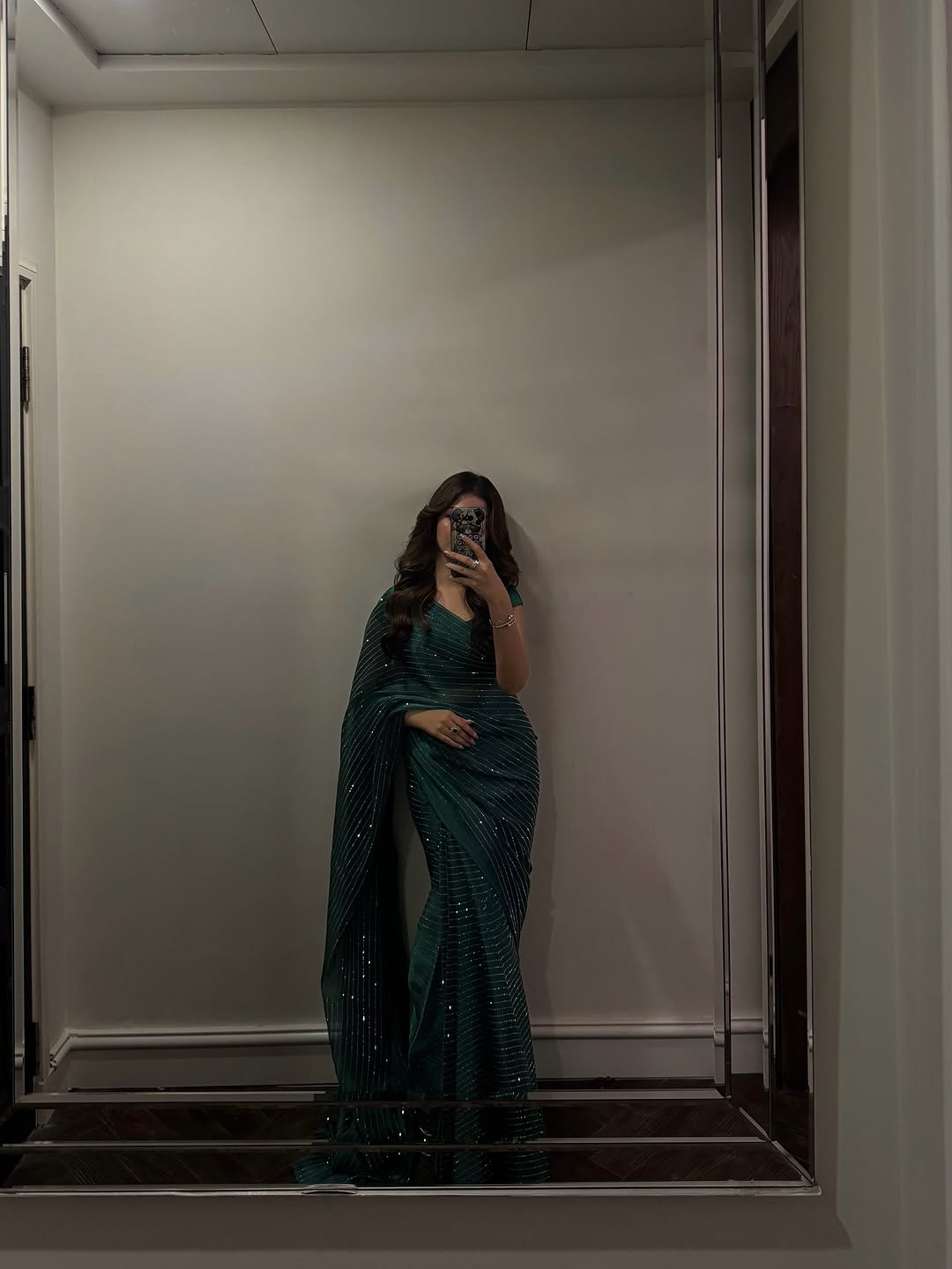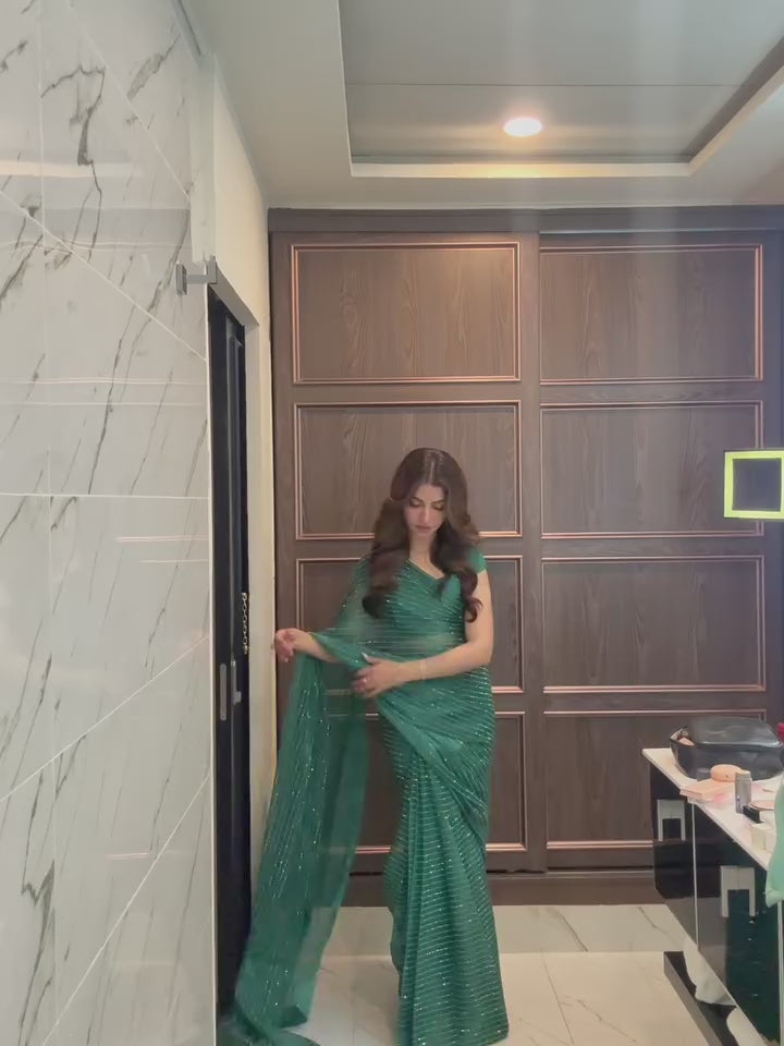 Elevate your festive and party looks with this stunning 3-piece emerald green shimmer saree set. Designed to make you shine with elegance and comfort, this outfit includes: